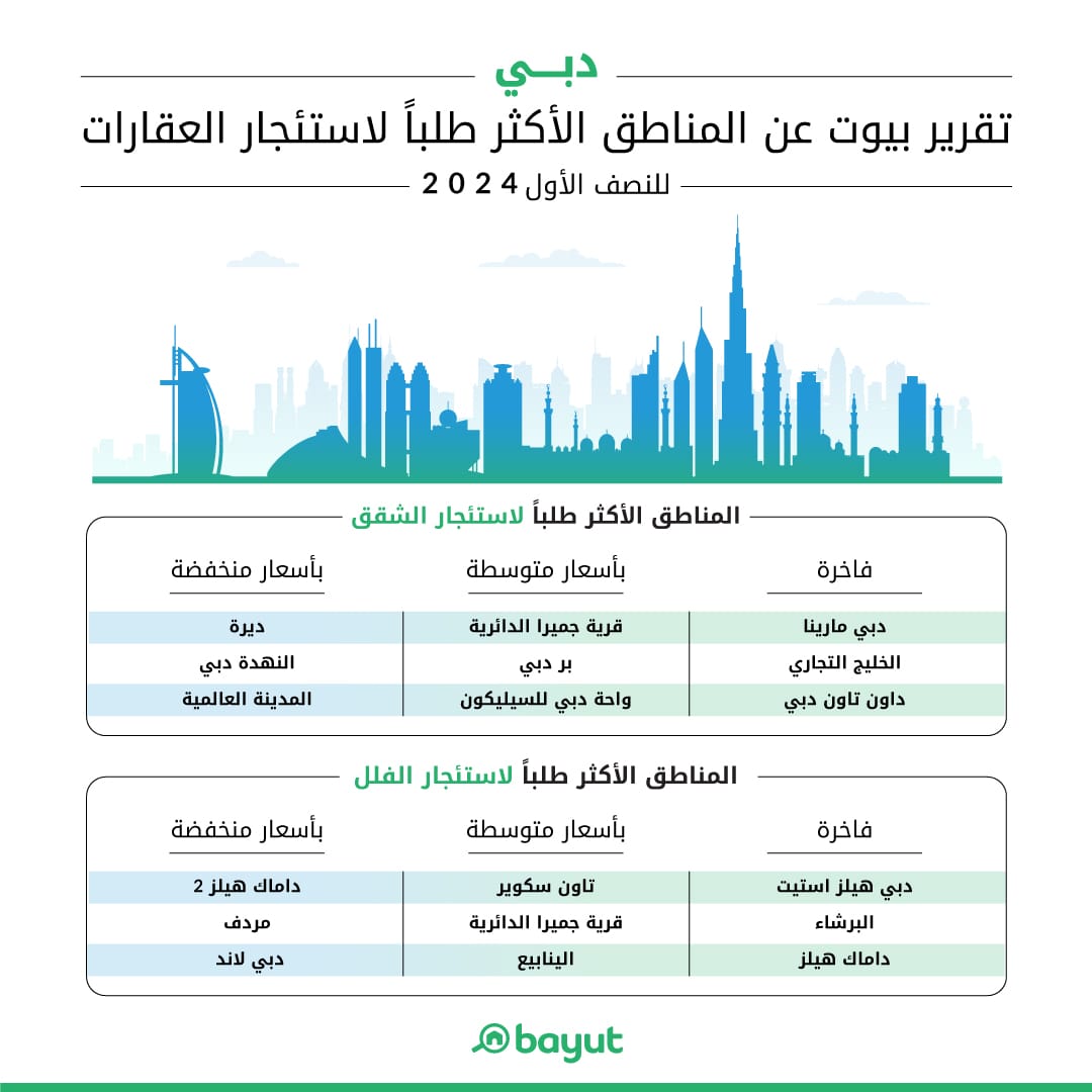 وبالنسبة لأولئك الذين يبحثون عن مساكن ذات أسعار منخفضة، أصبحت منطقتي ديرة والنهدة خيارين شعبيين للشقق، بينما جذبت منطقتي داماك هيلز 2 ومردف اهتمام الباحثين عن الفلل. في الفئة المتوسطة، حافظت شقق قرية جميرا الدائرية وبر دبي على الطلب العال بين المستأجرين، في حين جذبت الفلل في تاون سكوير وقرية جميرا الدائرية اهتمام الباحثين عن الفلل. في فئة العقارات الفاخرة، حافظت دبي مارينا والخليج التجاري على شعبيتها من حيث تأجير الشقق، بينما كانت دبي هيلز استيت والبرشاء الوجهات المفضلة لتأجير الفلل الفاخرة. سجلت أسعار الإيجارات في المناطق ذات الأسعار المنخفضة للفلل والشقق زيادات تتراوح بين 2% و9%. في فئة العقارات المتوسطة، سجلت إيجارات الشقق والفلل زيادات تصل إلى 10%. في فئة العقارات الفاخرة، ارتفعت أسعار الإيجارات للفلل والشقق بنسبة تصل إلى 10%.