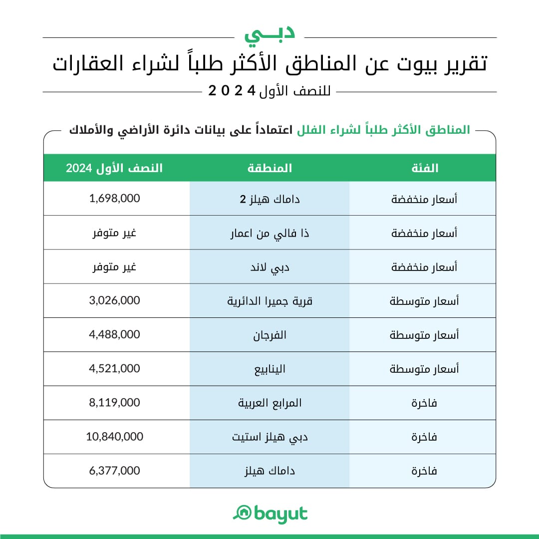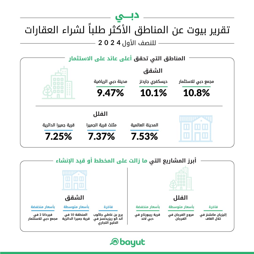 فيما أبدى المشترون والمستثمرون المهتمون بالعقارات ذات الأسعار المنخفضة اهتمامًا متزايدًا بعدة مناطق مثل المدينة العالمية، ودبي الجنوب، وداماك هيلز 2، و"ذا فالي" من إعمار. بينما تركز الاهتمام في الفئة المتوسطة على أحياء مثل قرية جميرا الدائرية، أبراج بحيرات جميرا، الفرجان، والينابيع. وفيما يتعلق بالعقارات الفاخرة، فقد جذب اهتمام المستثمرين مناطق مثل دبي مارينا، الخليج التجاري، المرابع العربية، ودبي هيلز استيت خلال النصف الأول من عام 2024.