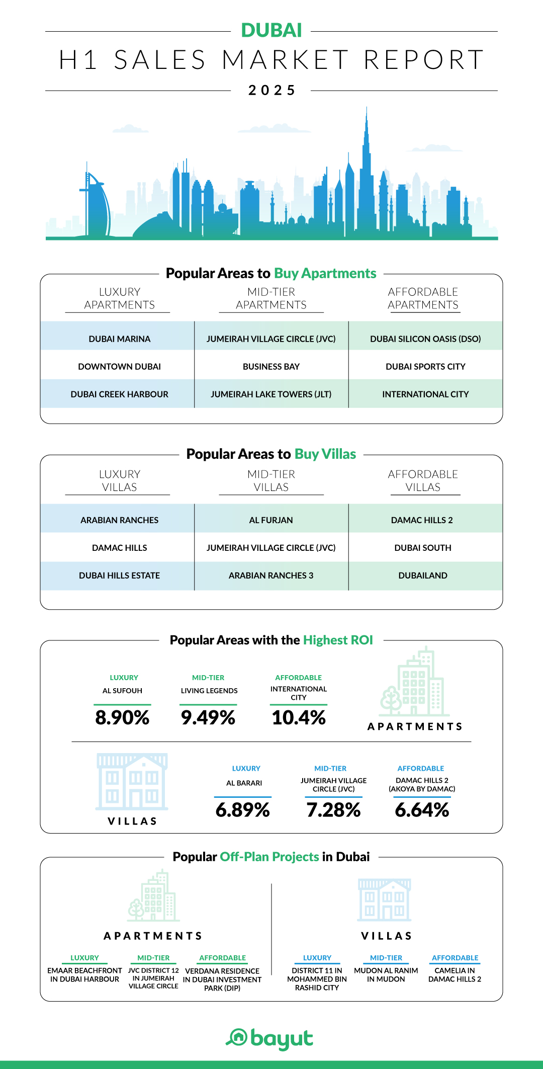 - واصل المشترون اهتمامهم بالمناطق الفاخرة المطلة على الواجهة البحرية والمناطق المُسوّرة. وسلّطت بيوت الضوء على منطقتَي ديستريكت 11 ومدينة محمد بن راشد آل مكتوم كموقعين لشراء الفلل، بينما أفاد دوبيزل بإقبال قوي على شراء الفلل في شوبا هارتلاند، ودبي هاربور، والوصل، ودبي هيلز استيت.