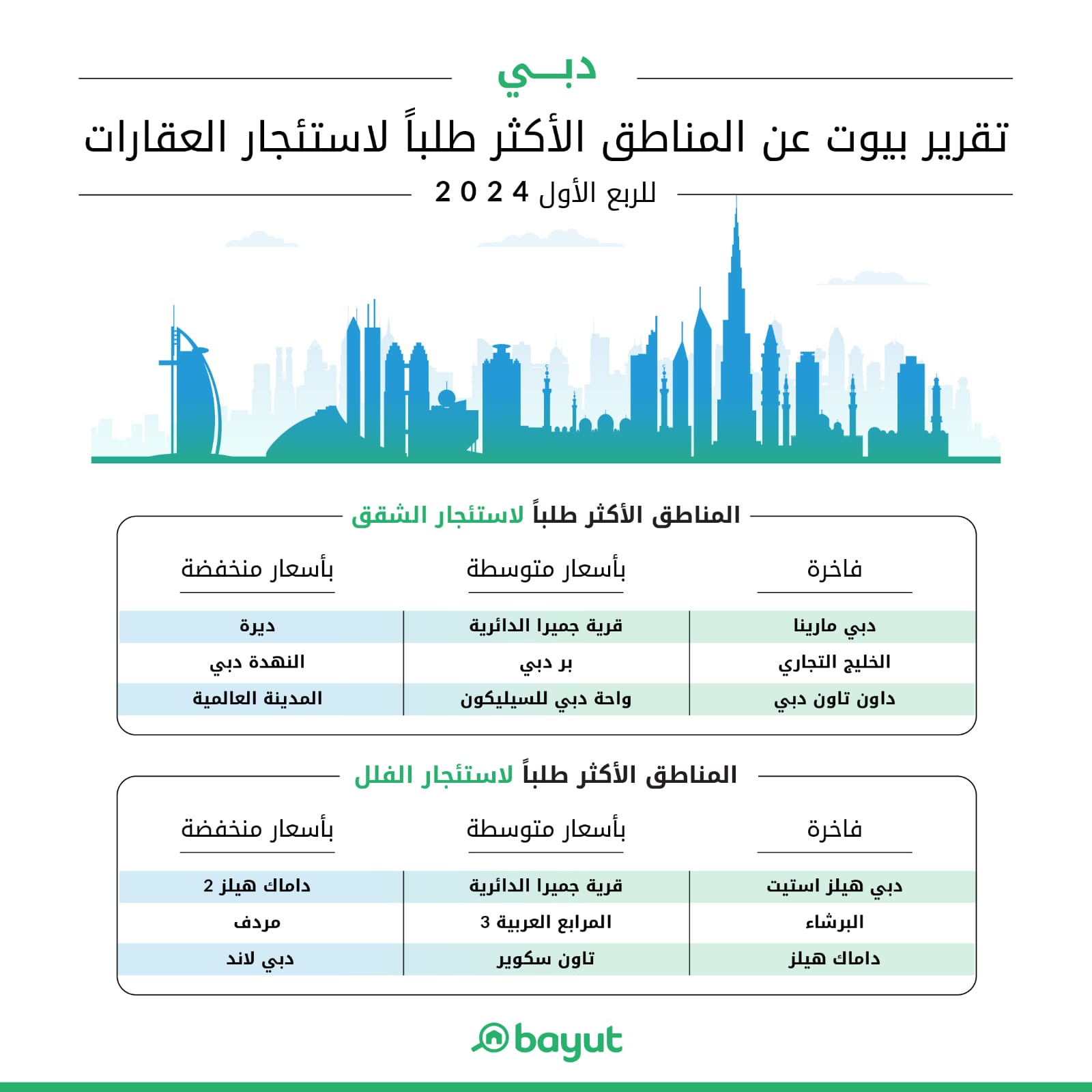 وضمن فئة العقارات الفاخرة، كانت "دبي مارينا" و"الخليج التجاري" المنطقتان الأكثر طلباً لاستئجار الشقق، في حين فضّل الباحثون عن الفلل منطقتي "دبي هيلز استيت" و"البرشاء".