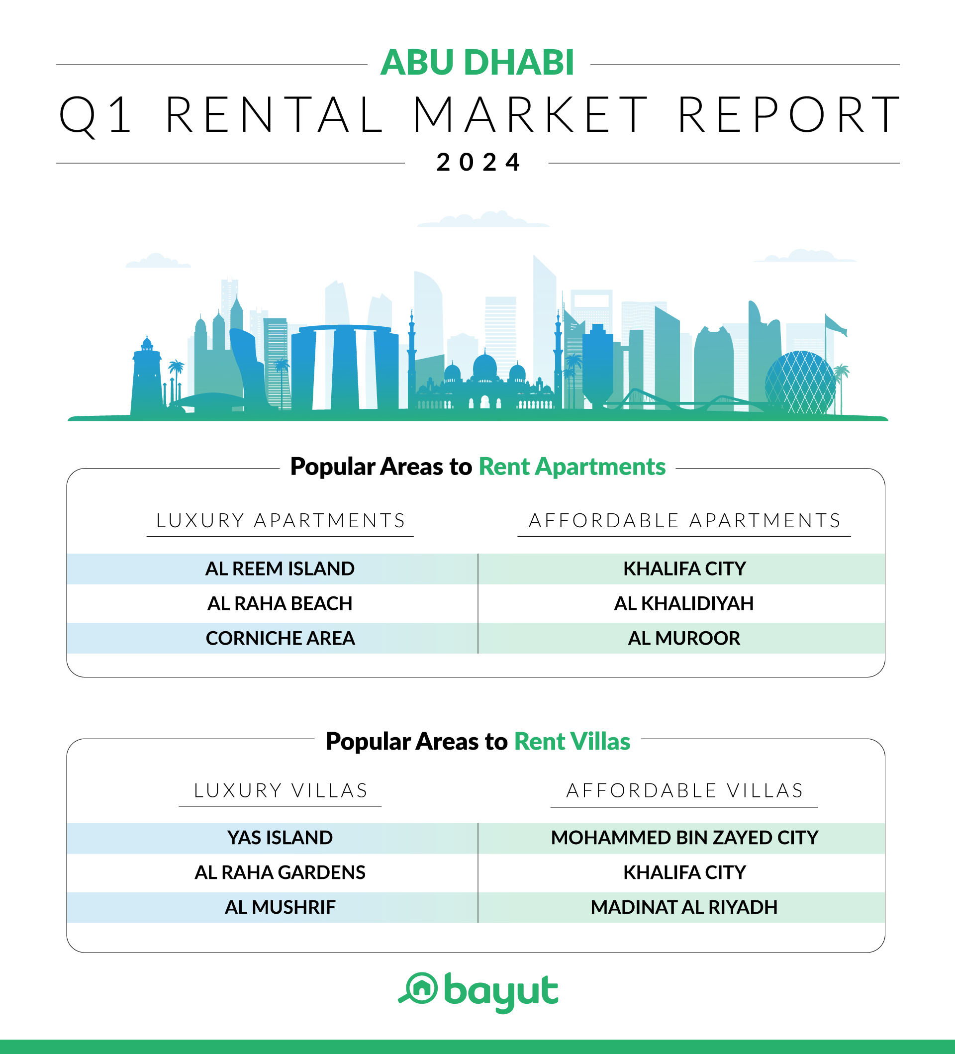 بالانتقال إلى تقرير موقع بيوت.كوم عن استئجار العقارات في أبوظبي، فقد أظهرت اتجاهات البحث في الموقع أن الباحثين عن شقق بأسعار منخفضة يفضلون السكن في منطقتي "مدينة خليفة" و"الخالدية"، في حين جذبت "مدينة محمد بن زايد" و"مدينة خليفة" أنظار الباحثين عن فلل بأسعار منخفضة. بالمقابل، كانت "جزيرة الريم" و"شاطئ الراحة" الأكثر طلباً لاستئجار الشقق الفاخرة، في حين أن "حدائق الراحة" و"جزيرة ياس" كانتا الأكثر طلباً لاستئجار الفلل بأسعار الفاخرة.