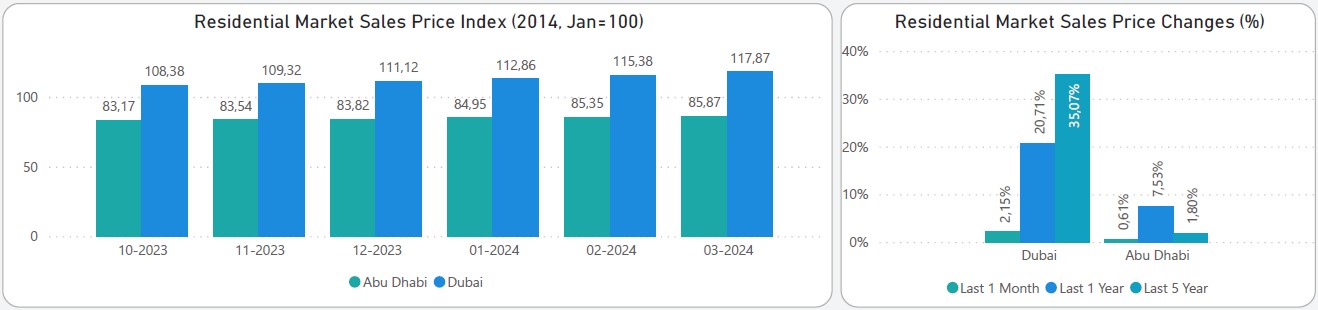 Dubai Residential Property Sales Price Index increased by 2.49 points, from 115.38 to 117.87, which represents an increase of 2.15% in March 2024. Prices also increased 20.71% y-o-y.